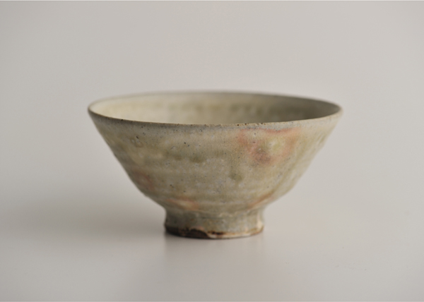 つやをおさえた灰釉の、うすみどりの地に、淡い桃色がほんのりうかびあがっています。かたちはほかのごはん茶碗とかわりませんが、こちらは、やさしく品のよい面差しです。ごはんにも、ちょっと気取ったお料理にも、ふところ深く、こたえてくれそうです。