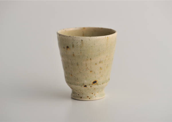 うすみどりいろの釉に、ほのかな桃色がみえて、くびれた高台と、すんなりのびるすがたは、ちょっと、異国の雰囲気もあって、いろいろな飲みものと、なかよくつきあってくれそうです。