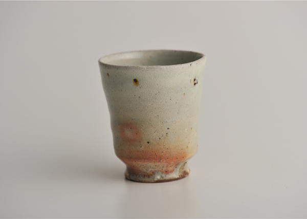 おだやかなグレーの釉薬の下から、土にふくまれる鉄分が、点、点、と顔をのぞかせます。窯の炎が引き出した、あかね色。お茶の時間が待ち遠しくなる、湯呑です。