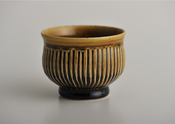 ぷっくりと丸いかたちの湯呑に、鎬のもよう。アメ色の釉は、濃いところは焦げたカラメル、うすいところはキツネ色になりました。くびれたところが指にかかって、手にもちやすい安定したかたちです。