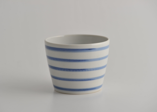 磁器らしいすっきりとした白に、ブルーの線がさわやかです。そばちょこという名にこだわらず、お茶でもコーヒーでも、小鉢としても、使い方はいろいろ。シャープな印象ですが、わずかなふくらみがあり、てのひらになじみます。「独楽絵」とは、ぐるりと何本も線を入れた模様のこと。伝統的なのにモダン。ボーダーのTシャツのように、出番が多くなりそうです。
