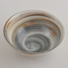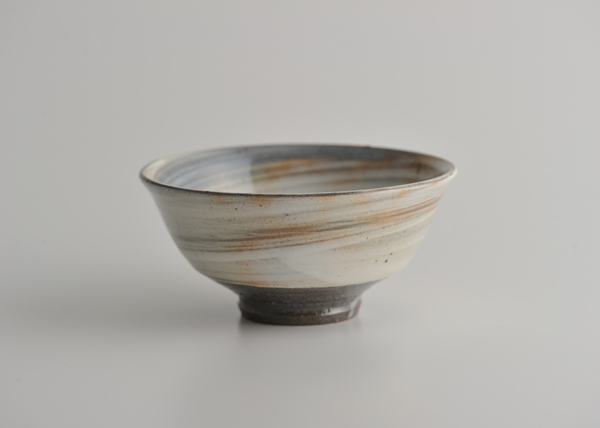 粉引の白化粧を、刷毛でしゅっと引いたら、黒っぽい土の色との混ざり具合で、おもしろい濃淡があらわれました。食べすすむにつれて見えてくる柄も楽しい。やや大ぶりなうつわですが、高台のわずかなくびれで引き締まって、女性の手にもなじむかたちです。