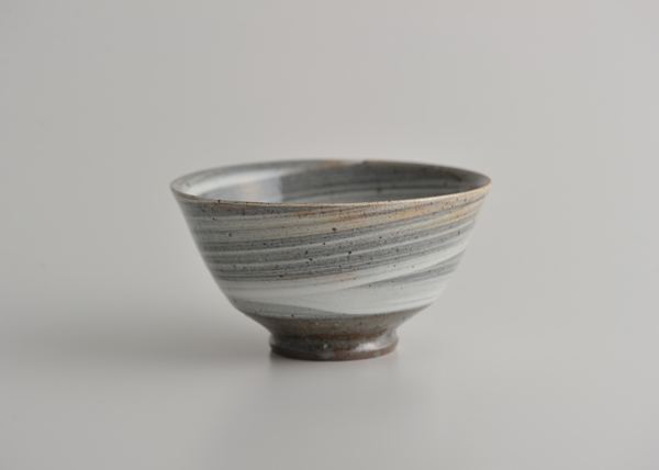 刷毛目飯碗1と、高さは同じですが、口径がやや小さめなので、小柄な印象です。よそえるごはんの量もちょっと少なめ。くるくると渦巻く模様は、ろくろの回転と手の加減でつくられます。意図してもつくれない、ひとつしかないうつわです。