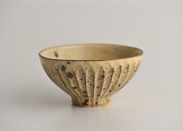 1本いっぽん、手仕事で彫っていく、鎬(しのぎ)は、古くから日本のうつわにつかわれる模様ですが、このおちゃわんは、ヨーロッパのアンティークを思わせるすがたです。カフェオレボウルのようであり、でも、やっぱり白いごはんが、似合います。