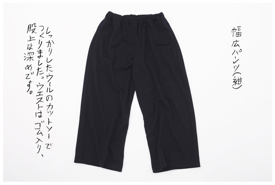 夏の販売で好評だったコットンの「幅広パンツ」。 同じ型で、ウールのパンツをつくりました。