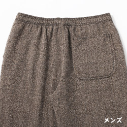 すそリブパンツは、 レディス、メンズともに 同じデザインですが、 メンズのものは、 おしりにポケットがついている点と、 前あきのボタンがついている点が 異なります。 また、すそリブパンツは、 素材がツイードのため、 素肌に直接はいていただくと、 チクチクとした肌触りになります。