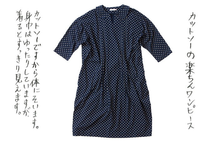 「ね、いい素材でしょう? このワンピースを着ると、 スマートに、すっきりと見えるんです。 そして、とっても、らくちんなのよ」(大橋さん)