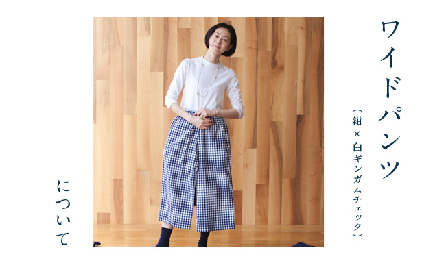 かたちは、「a.」の定番、 すとんとしたストレート。 カーキの幅広パンツとまったく同じなのですが、 素材のちがいで、ずいぶん雰囲気がかわりました。 コーマ糸(高級綿糸)を使った高密度ギンガムなので、 強度があり、ケバ立ちが少ないのが特徴です。 カーキの幅広パンツは ウエストにひもをつけましたが、 こちらは、素材がやわらかいので、 ゴムのみで留める仕様になっています。