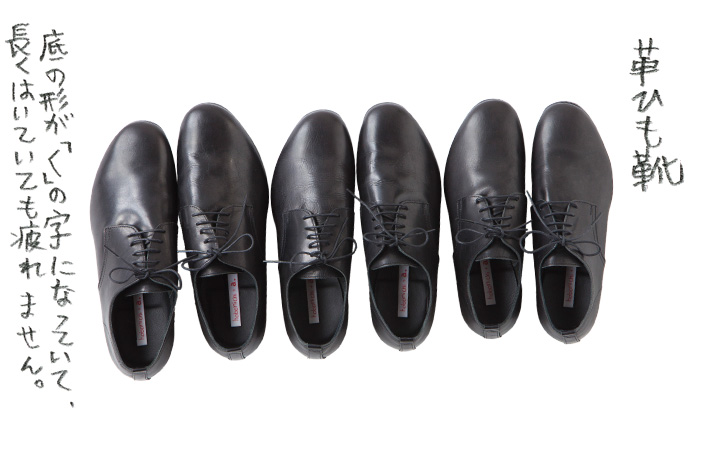 秘密は、日本人の足のかたちに沿うように つくった木型。 つま先に余裕をもたせつつ、 人によって異なる 甲の高さや幅の広さに対応できるよう、 ボックストゥはゆったりと、まるく、 履いていてもずれないように工夫されています。