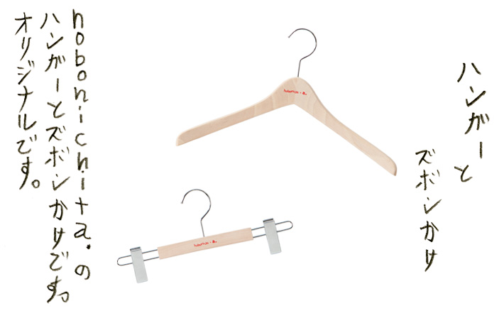 天然木・無塗装のオリジナルハンガー。 大橋歩さんが書いた 「hobonichi + a.」のロゴ入りです。 創業60年を超える、専門の工芸会社さんに制作を依頼。 肩のライン、長さ、厚み、素材などは すべて大橋歩さんといっしょに決めました。 なお、今回販売する洋服には、 トップスにはハンガー、 ボトムスにはズボンかけが 1着につき1点、 「ほぼ日ストア」の特典としてついています。