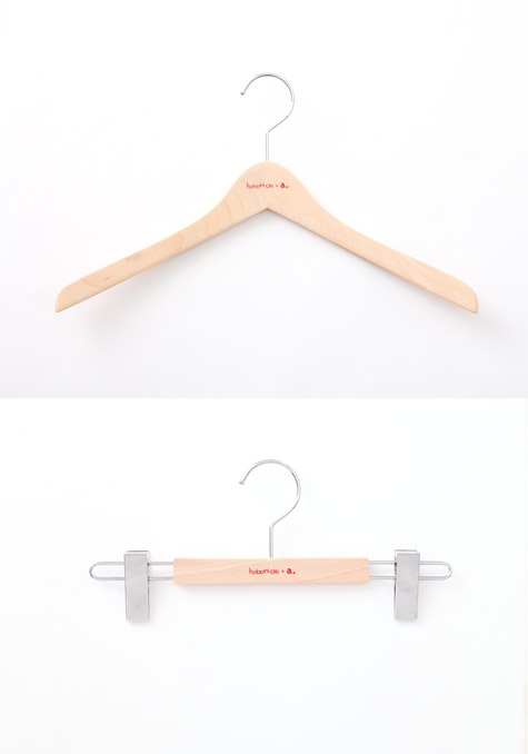 天然木・無塗装のオリジナルハンガー。 大橋歩さんが書いた 「hobonichi + a.」のロゴ入りです。 創業60年を超える、専門の工芸会社さんに制作を依頼。 肩のライン、長さ、厚み、素材などは すべて大橋歩さんといっしょに決めました。 ハンガー(レディス)より少し大きめの 男性サイズ、ハンガー(メンズ)も用意しました。 今回販売する洋服には、 トップスにはハンガー、 ボトムスにはズボンかけが 1着につき1点、 「ほぼ日ストア」の特典としてついています。