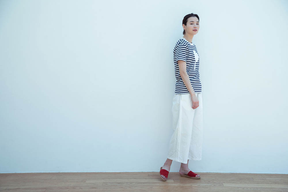 すこし詰まった襟ぐりと、内側に入った肩先、短めの袖。