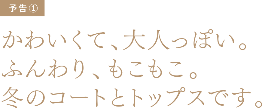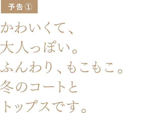 もこもこ、ふわふわ。 やわらかくてやさしくて、 かわいらしいのに、 大人のエレガンスも感じられる、 不思議な魅力のコートとトップス。
