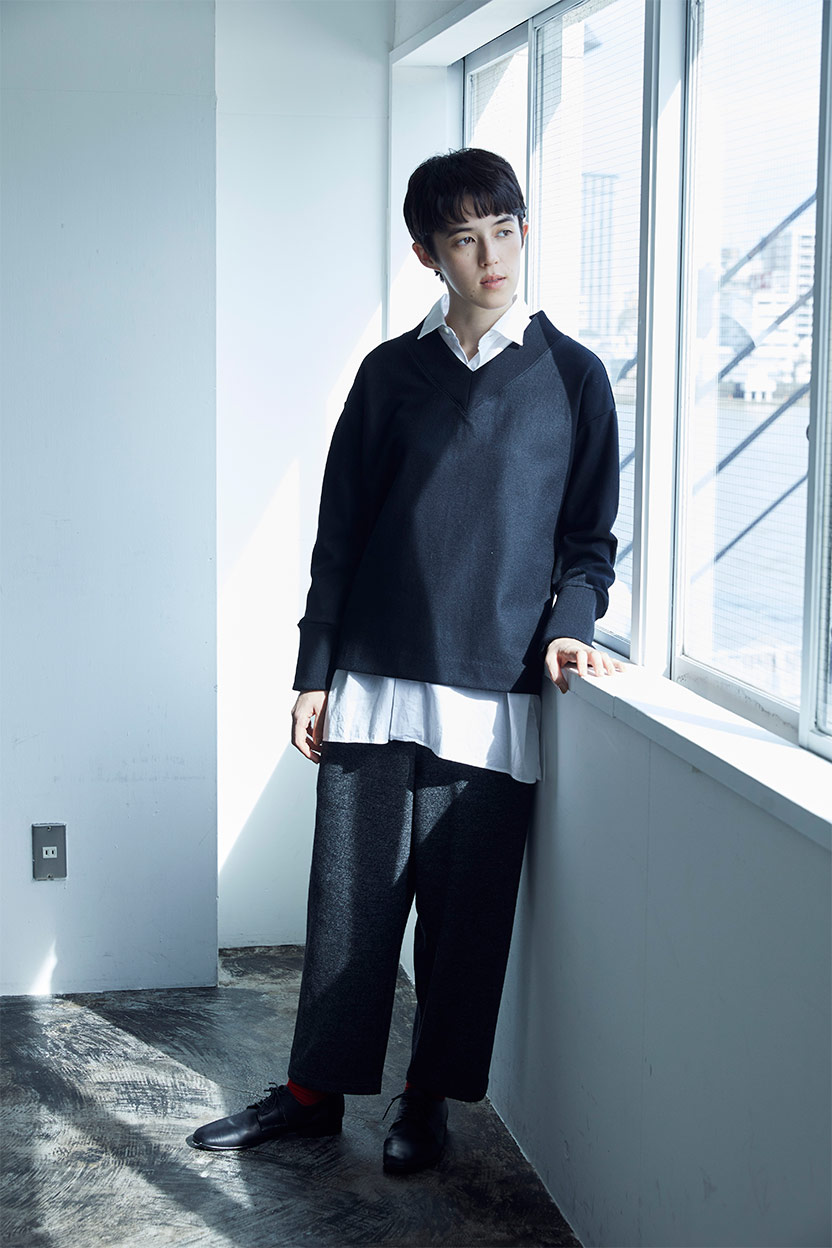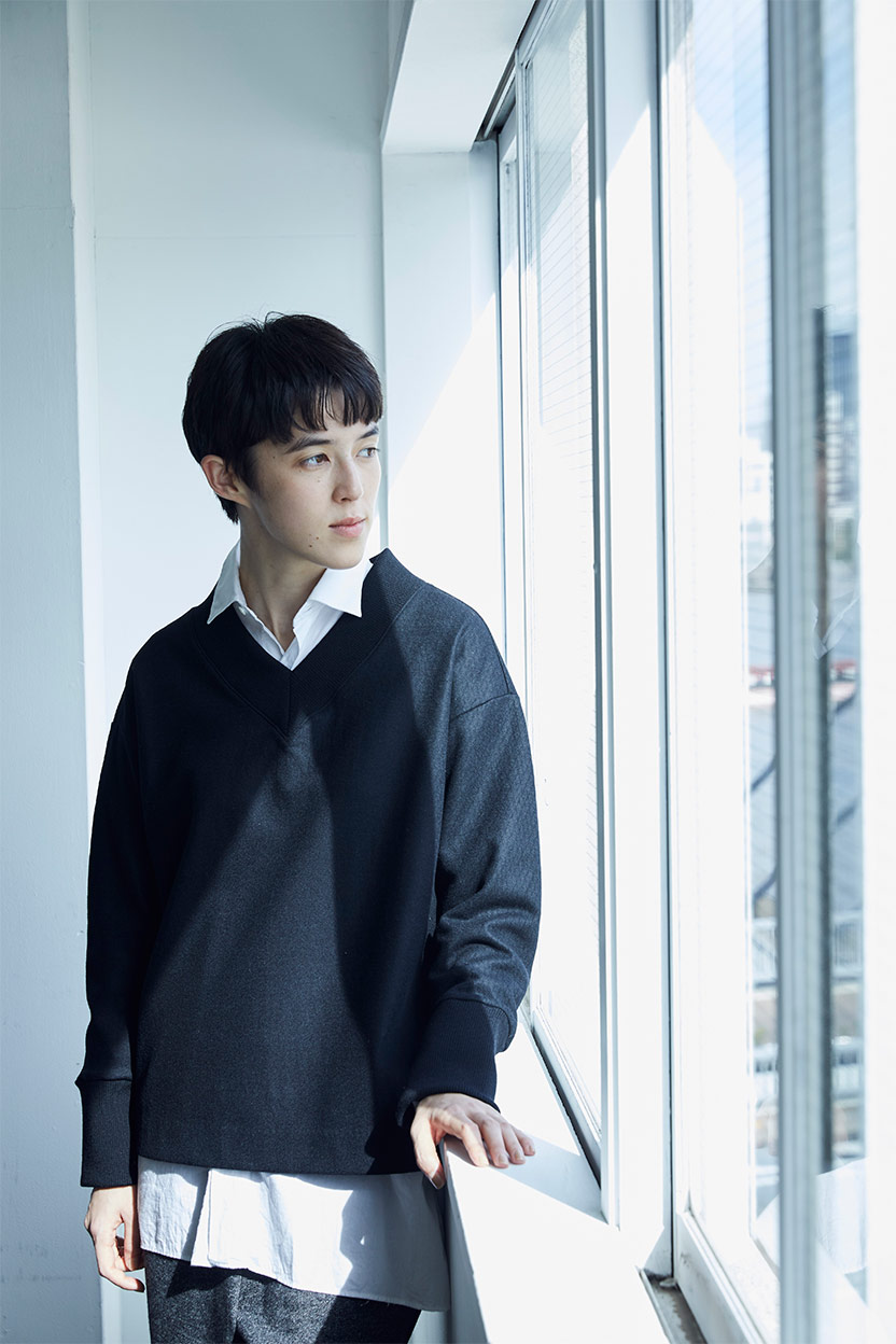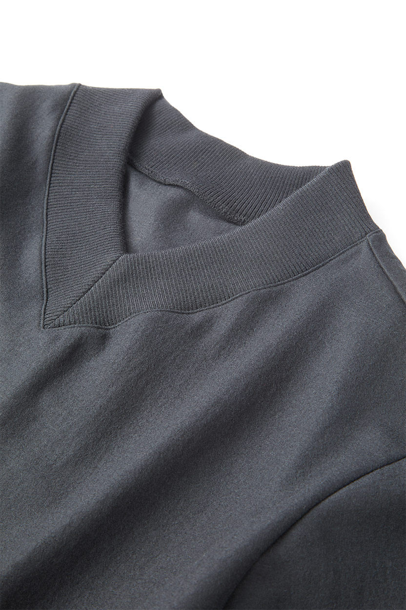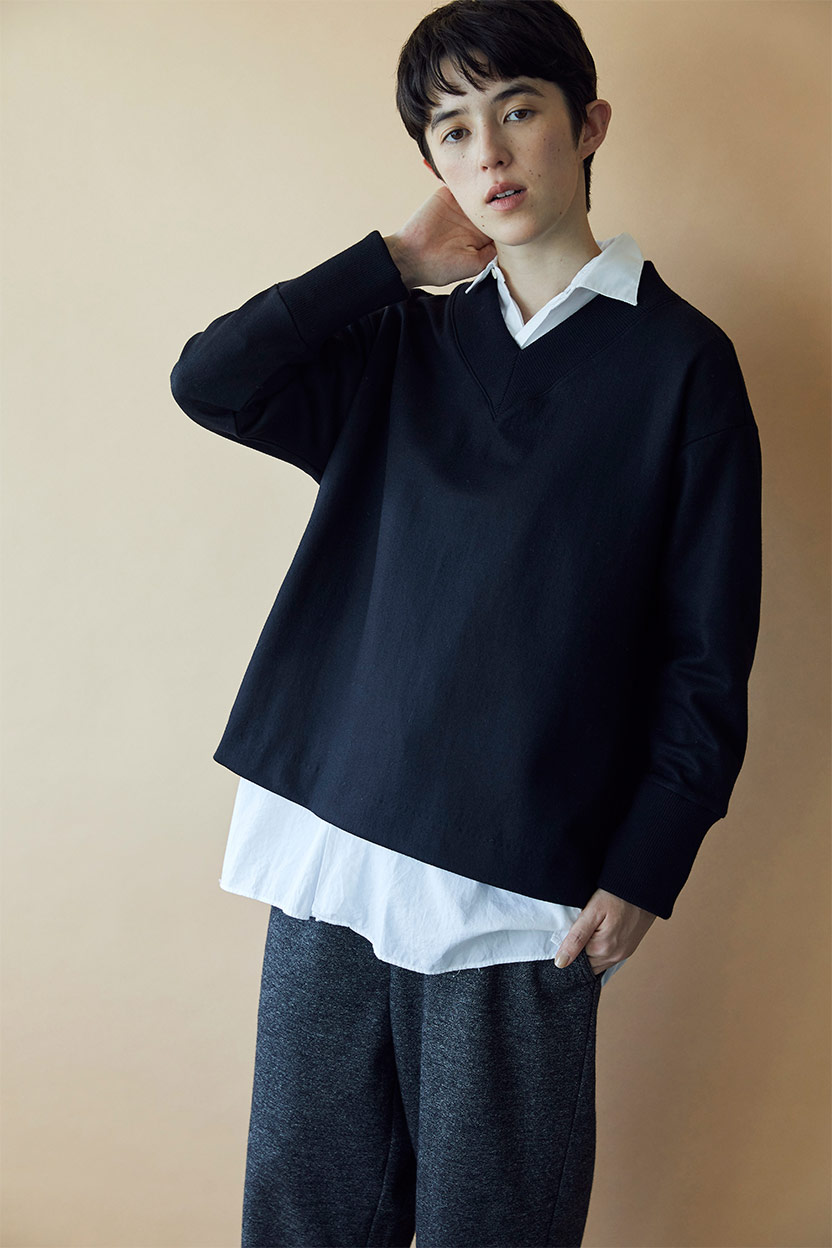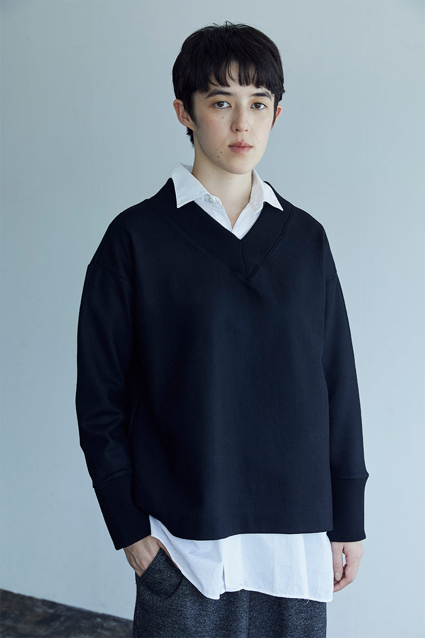 太めのリブ編みが少し立ち上がる襟ぐりは、