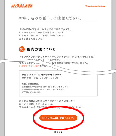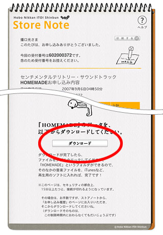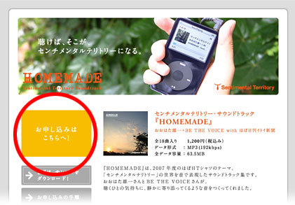 まず『HOMEMADE』のファイルを開くためには ハードディスクに「200MB以上」の空き容量が必要です。 また、お使いのパソコンや、ポータブルプレーヤーで 『HOMEMADE』が再生できるかどうか チェックしていただきましたか? サンプル曲をダウンロードしてみてくださいね。 いまなら、BE THE VOICEさんの 「ほぼ日アンケート2007のテーマ」を ダウンロードできますよ! ハードディスクの空き容量が十分にあり、 チェックもお済みのかたは、次へお進みください。