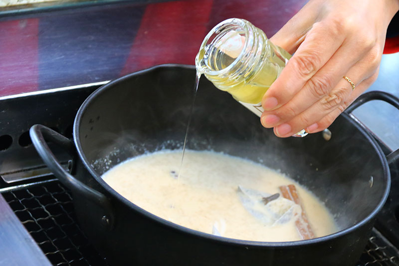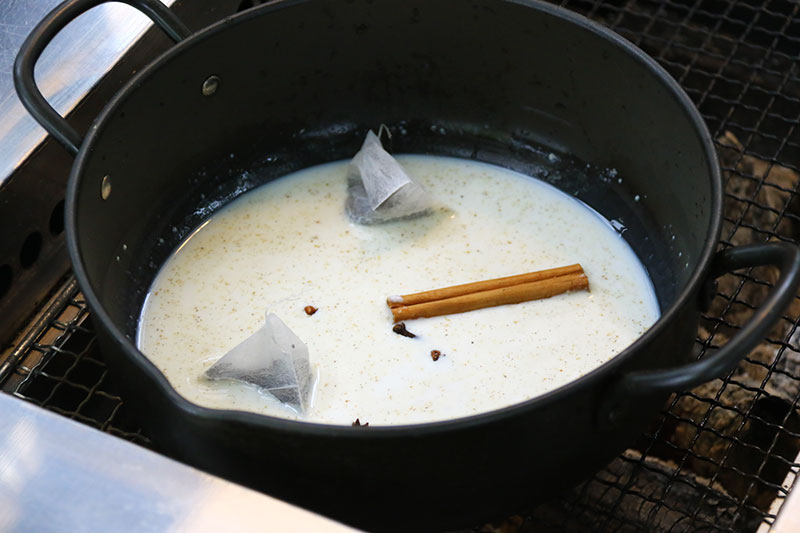 ▲鍋に牛乳、クローブ、シナモン、