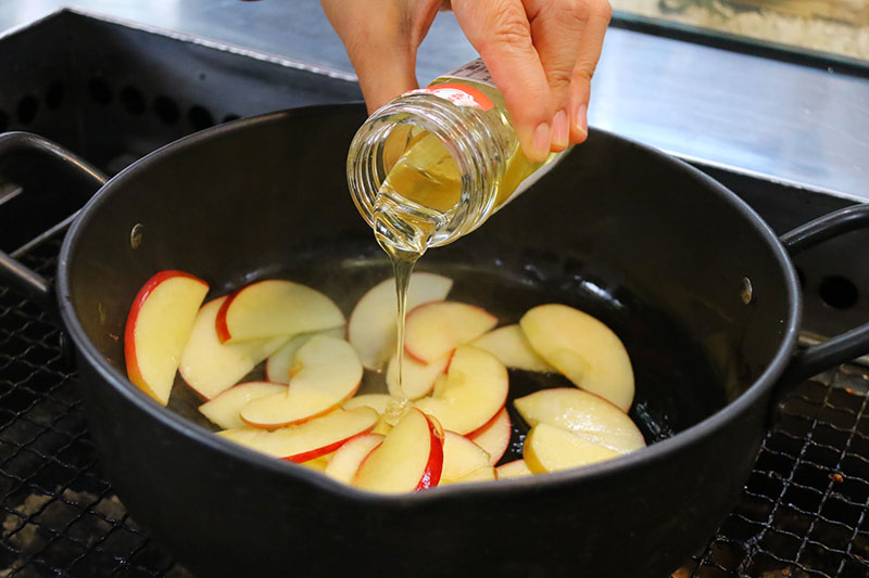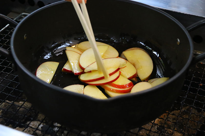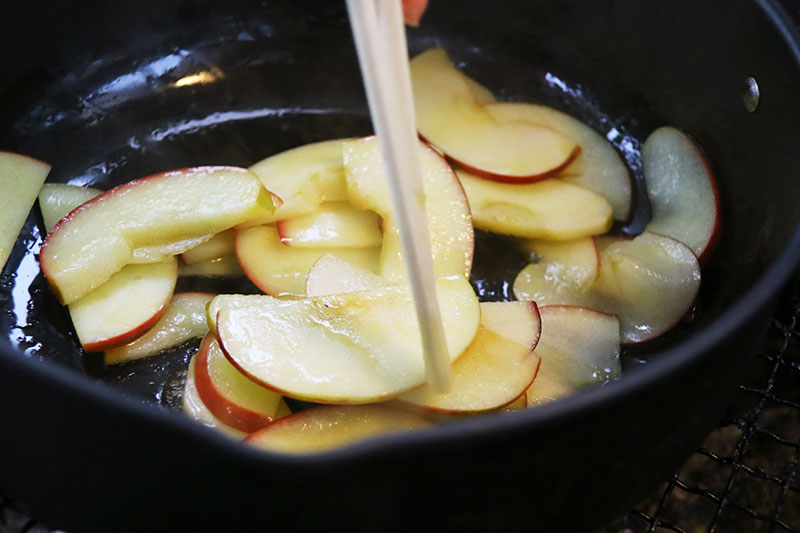 ▲オリーブオイルでりんごを炒めます。