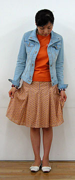 オレンジ系の入った柄のスカートに アプリコットのロンT。 その上から薄めのデニムのジージャンが よく合います! 元気が出そう!!!足取りも軽いね! (ゆーな)