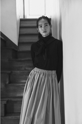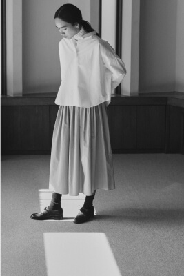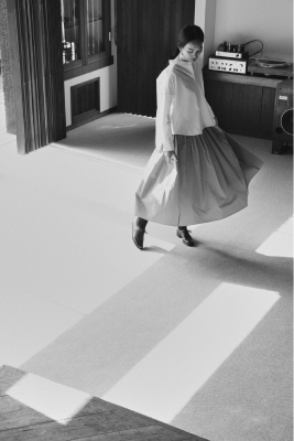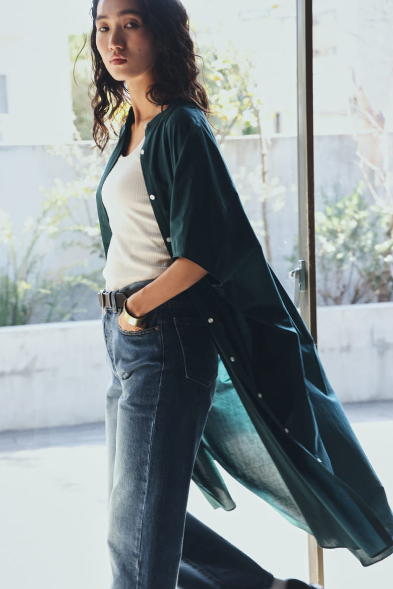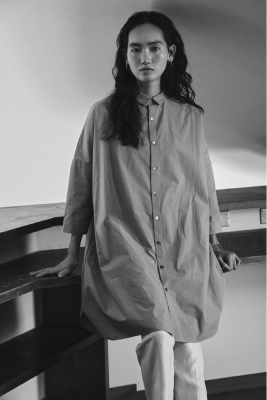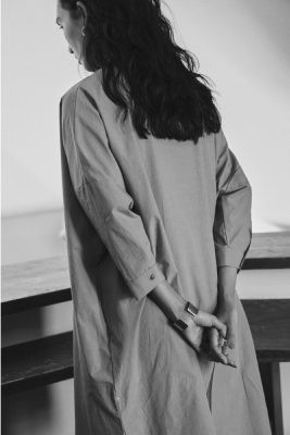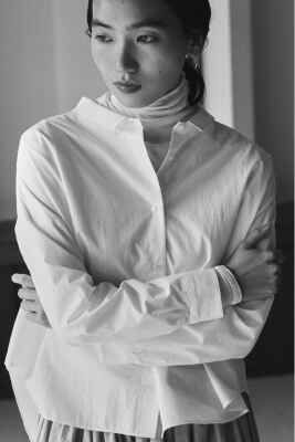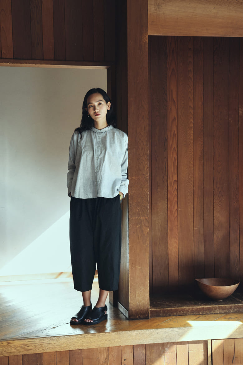 遠州織物は昔ながらのシャトル織機を使い、通常の20~30倍の時間をかけて極細の糸をゆっくりと織った高密度な生地が特長です。しなやかで、ハリがある、美しい落ち感。薄くて軽いのに、透けすぎない品のよさ。着るほどにからだになじむ、癒やされる着心地。