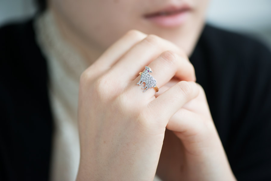 瞳にルビーをあしらった「子羊のダイヤモンドリング」。