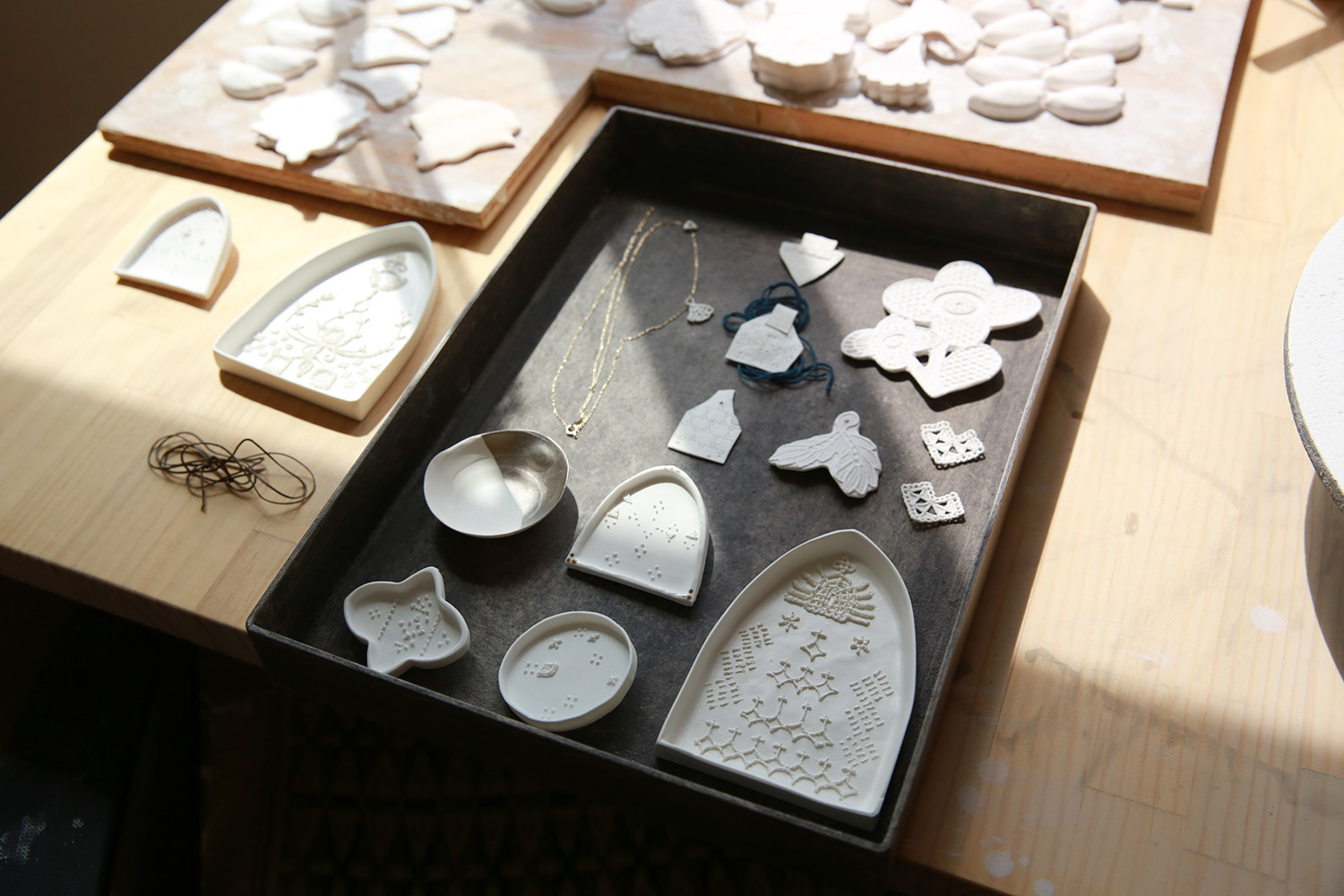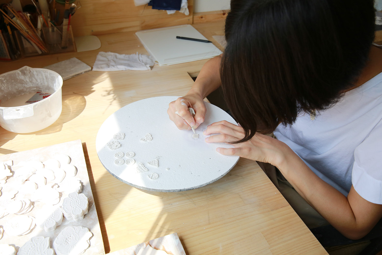 ▲白磁を細く絞り出して、レース模様を描いているところ。