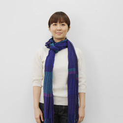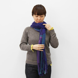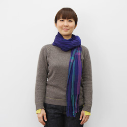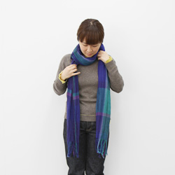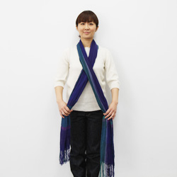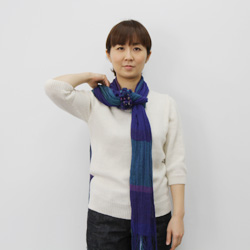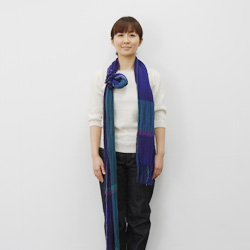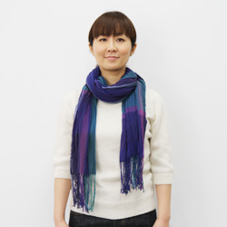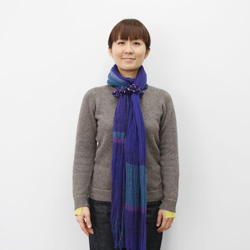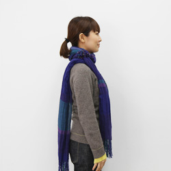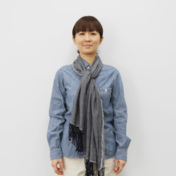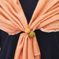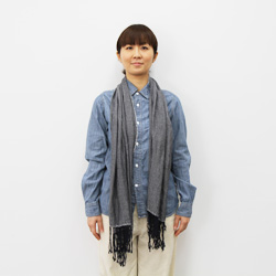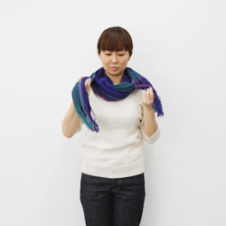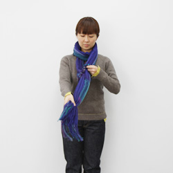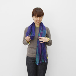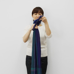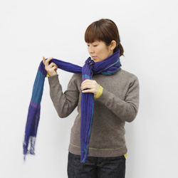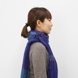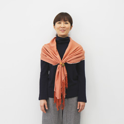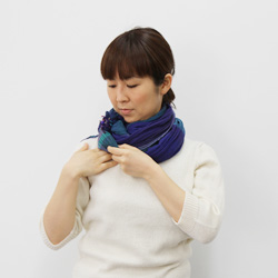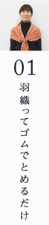 | 肩に羽織るように巻いて、 胸の前でギャザーをつくりながらまとめ、 ゴムでとめます。 布の端のふぞろいなところが 出るようにととのえると、 ニュアンスがだせますよ。 |