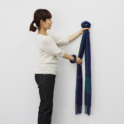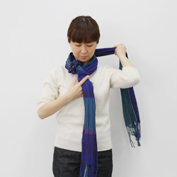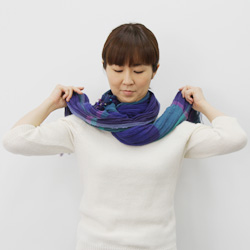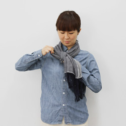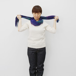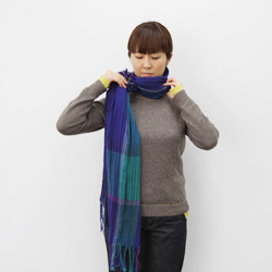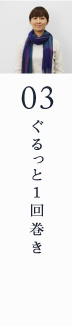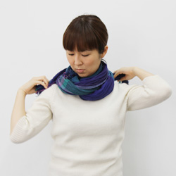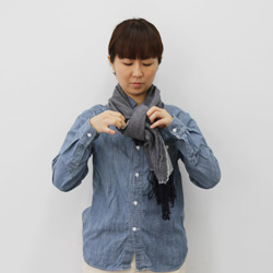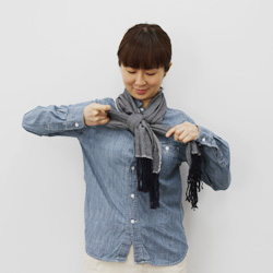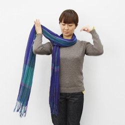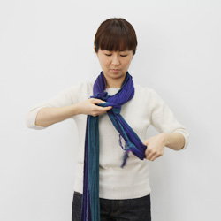 | 左右の長さをずらして首にかけます。 | ぐるりと巻きます。 | 左右が同じくらいの長さに なるようにします。 |