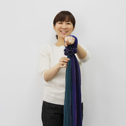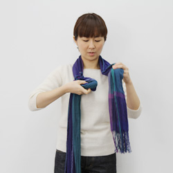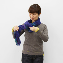 | 2つ折りにして首にかけます。 | わっかになっているところに、 フリンジのほうをとおします。 |