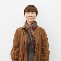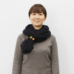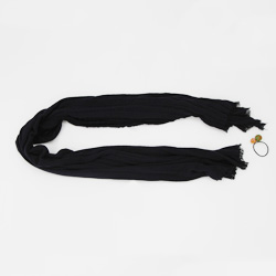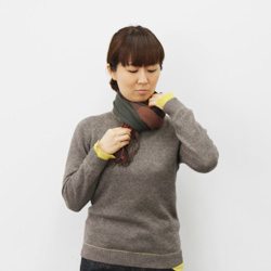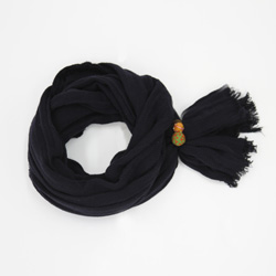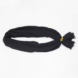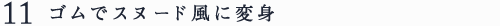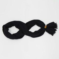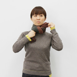 | ねじったまま首にかけます。 | 2つ折りのほうのわっかに フリンジのほうをとおします。 |