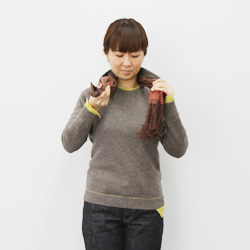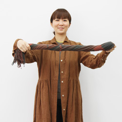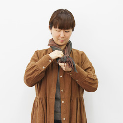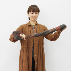| 2つ折りにして、だいたい真ん中を持ちます。 | フリンジのほうを持って、 ぐるぐるぐるぐる、ねじります。 |