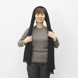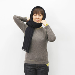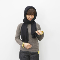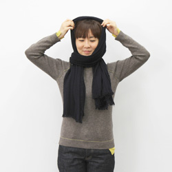 | 首まわりをぐるりと巻いて前にたらします。 | 頭にかかっている前のふちを持って | フードをぬぐようにうしろにおろします。 |