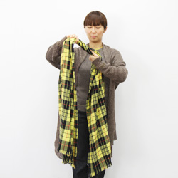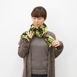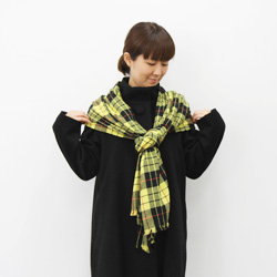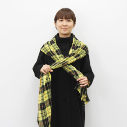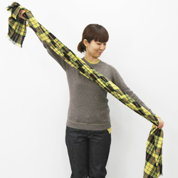| まず、幅いっぱいにひろげます。 | まんなかあたりを、1回ねじります。 | ねじったところを首のうしろにして、 すこし長さをちがえてたらします。 |