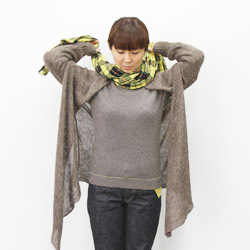 | こんどは上から下に、結び目の中をとおします。 | 肩にかかったところをととのえます。 | できあがりです。 |