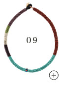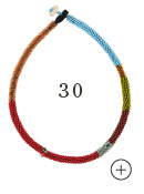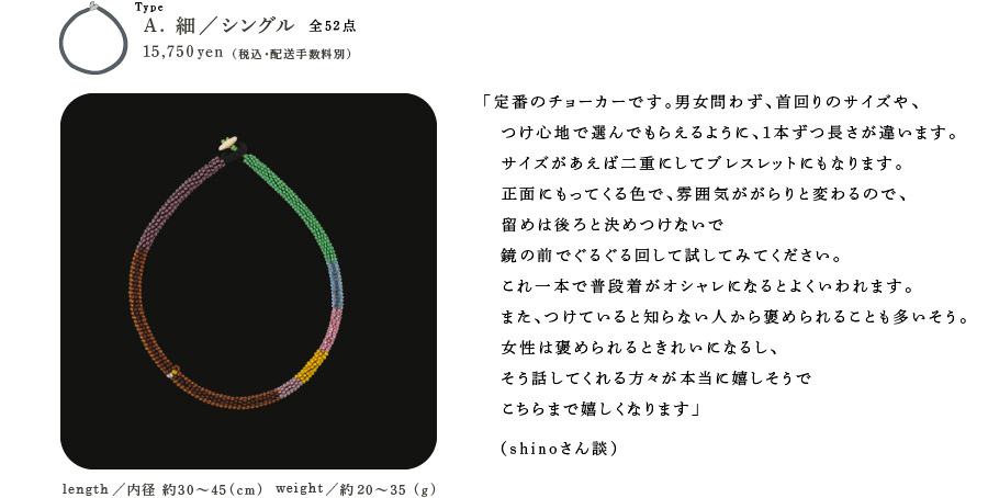 チェコ共和国の首都、プラハに暮らして21年になる 日本人アーティストのshino(シノ)さんがつくる、 ガラスビーズのチョーカーです。 (shinoさんには、2009年、 大橋歩さんのギャラリーで 展覧会がひらかれたさい、 こんなインタビューを させていただいたことがありました。)
