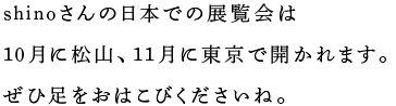 ![]() [shino's bijoux] 【会場】うつわ 良 愛媛県松山市南梅元町934-59 tel.fax. 089 975 4241 【会期】2013年10月18日(金)- 23日(水) 【時間】11:00 - 18:00 会期中無休 |