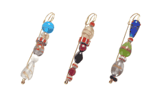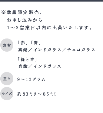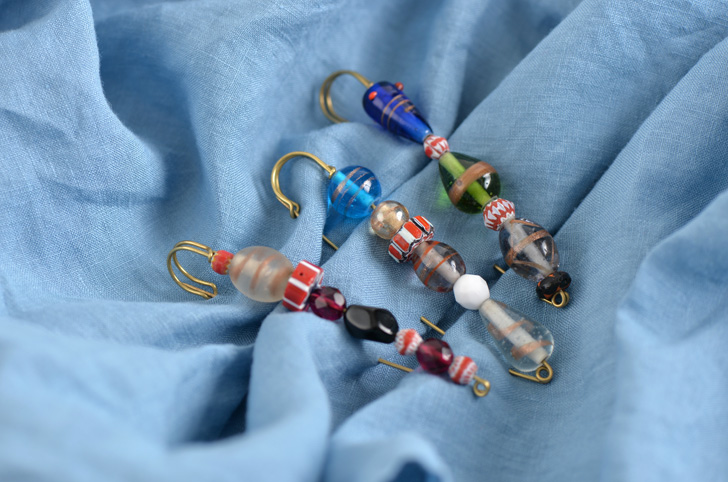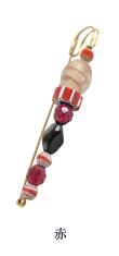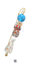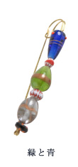 真鍮のピンに、 インドでつくられた手巻きガラスと、 大きさのことなるカラフルなチェコの ガラスビーズがついています。 ガラス工芸のさかんなチェコでは ふるくからたくさんのガラスのビーズがつくられてきました。 機械でカットしたものを、 火をつかってなめらかに加工しているので、 ひとつひとつに手作り感がのこっています。 色の組み合わせはこの3種類ですが、 手巻きガラスとビーズの色や形状などには ひとつひとつ、たのしい個体差があるんですよ。
