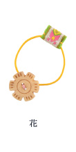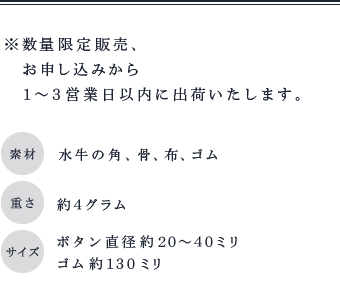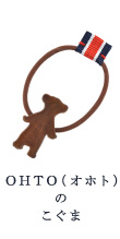 水牛の角や骨を削って つくったアイテムです。 もともとはネパールでつくられた ボタンなのですけれど、 きれいな色のゴムと、 刺繍をした布をつけて、 こんなにかわいいアクセサリーになりました。 くびまきを留めるだけじゃなく、 そのまま手首につけてブレスレットにもどうぞ! ちなみに花のボタンは、水牛の骨を紅茶で染めて。 まるいボタンは、水牛の角を火であぶって、 それぞれの色をつけているんですよ。 OHTO(オホト)のこぐまは、 ボタンそのものが 「ほぼ日」デザインのオリジナルです。