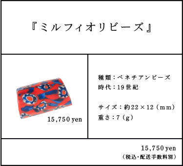 千の花々が咲き乱れるような美しさ、 という名前をもつビーズです。 ベネチアンビーズの生産地であるムラーノ島では ムッリーネとも呼ばれるミルフィオリビーズが 19世紀、アフリカ交易玉として作られ、 計り知れない高度な技術と豊かな色彩が特徴です。 ベースになるガラス種にカットした 花や星文様のガラスチップを貼り付け、 デザインされていきます。 ミルフィオリはこのカットされた文様の美しさと 色彩の美しさが問われるビーズ。 その中でも筒状形は貴重です。 また、貼り付けられたチップは 人気のシェブロンビーズのカットされたもので、 大変美しい文様となっています。 (インドラさん 談)