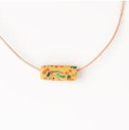 フィオーレは“花”を意味しますが、 ベースのガラスの上に細いガラス棒を溶かし 絵付けするように花草文様を描き装飾したビーズを、 ベネチアンビーズでは、 総称してフィオーレと呼びます。 ヴェッテとはガラス棒での絵付けの技法のこと。 このフィオーレヴェッテビーズは、 黄色の長方形のビーズに可愛らしい花と草の文様が ガラスで描かれている、とてもめずらしいもの。 ベネチアンビーズの中でも なかなか見ることのできない逸品です。 (インドラさん 談)