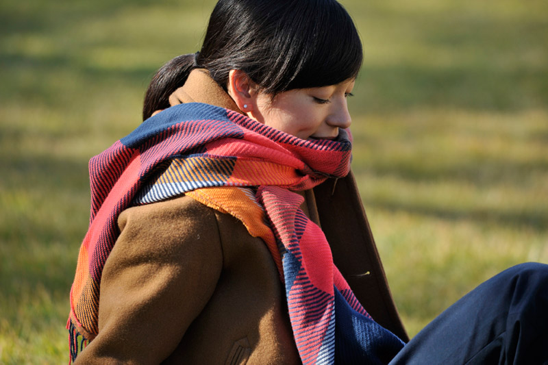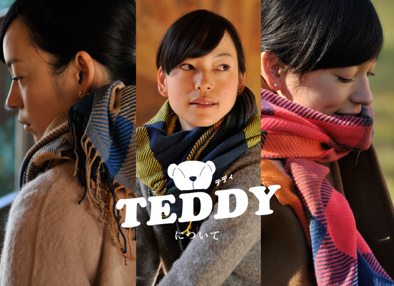 最初のアイデアは 「うんと大きなチェック柄をつくろう!」 ということでした。 拡大コピーをしたときみたいに、 織り模様をはっきりとだしたくて、 いつもなら「平織り」という織り方にするところを、 ためしに、「綾織り」にかえて、 中羊糸の双糸を使って チェック柄を織ってみたところ‥‥。 こんなうれしい変化がありました。 さわりごこちが「ムクムク」に! まるでぬいぐるみのようなやわらかさと、 弾力をもつくびまきができたのです。
