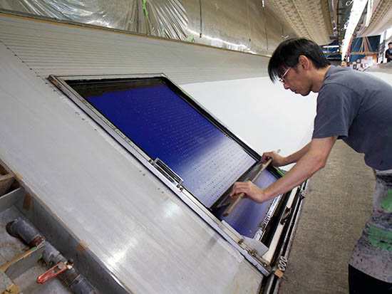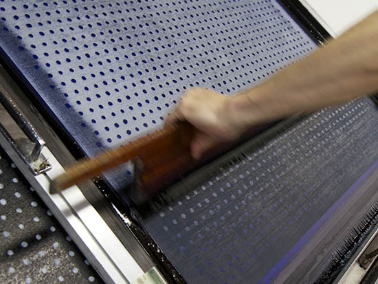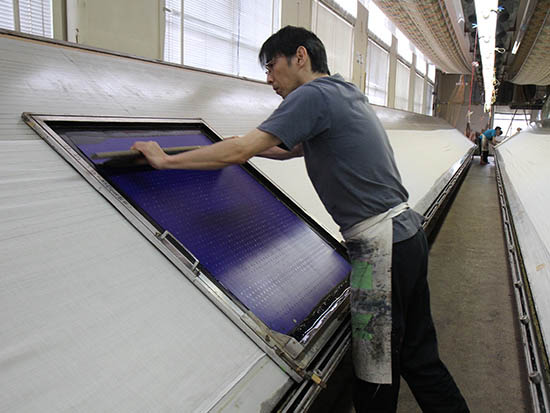 さらに紺地を1版重ね、2回プリントを行ないます。