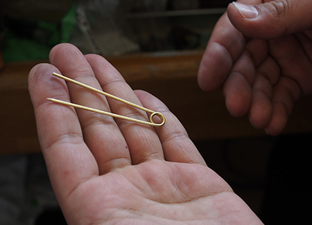▲真鍮をくるっと曲げます。簡単そうに見えて、力の要る作業。