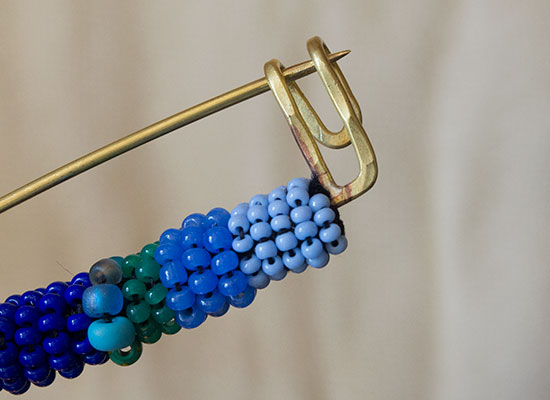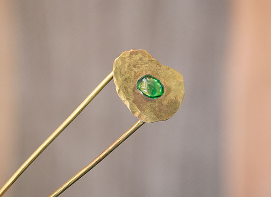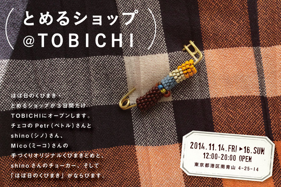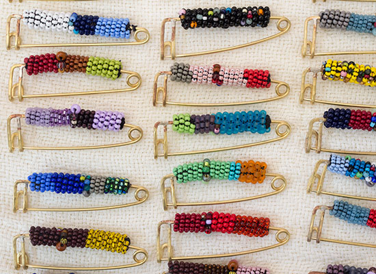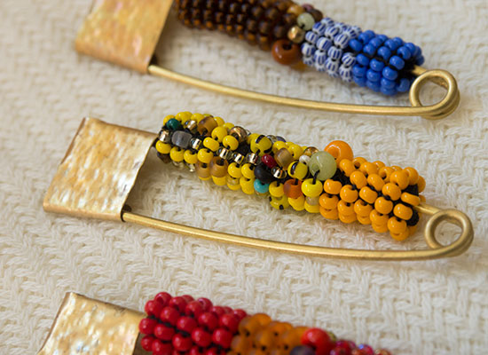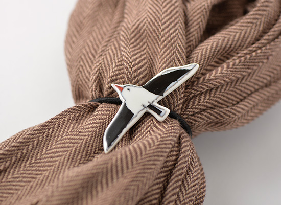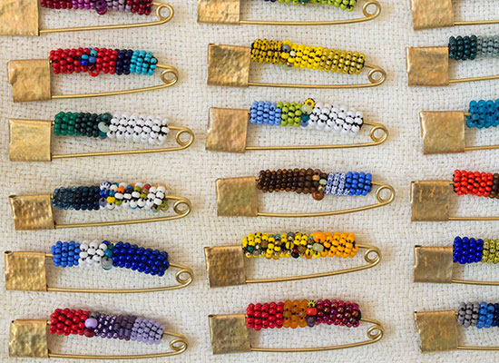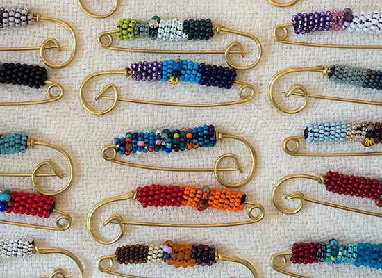 彼女のつくったオリジナルのくびまきピンがならびます。