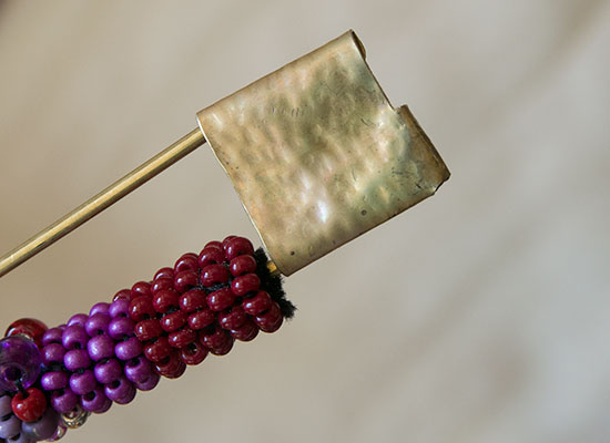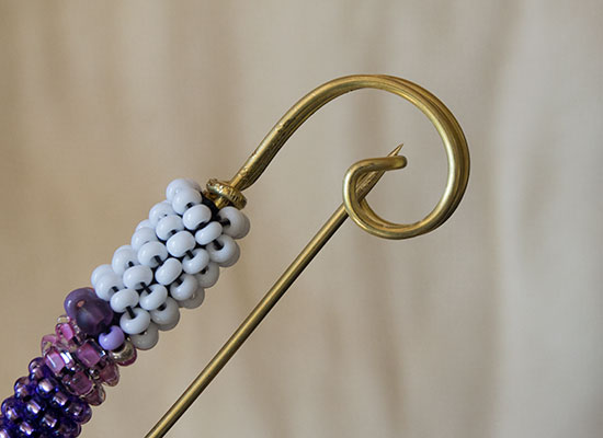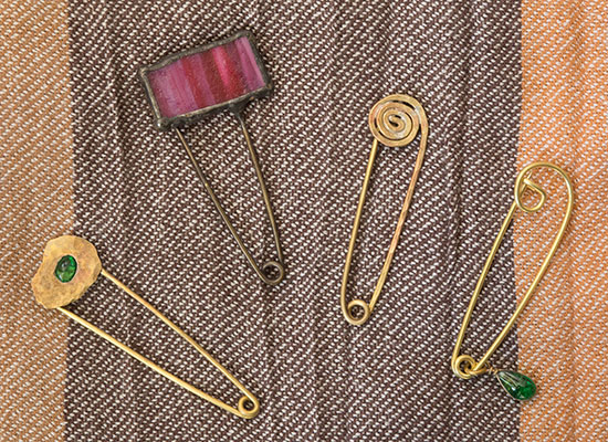 手づくりの金属のピンにつけたくびまきピンがならびます。