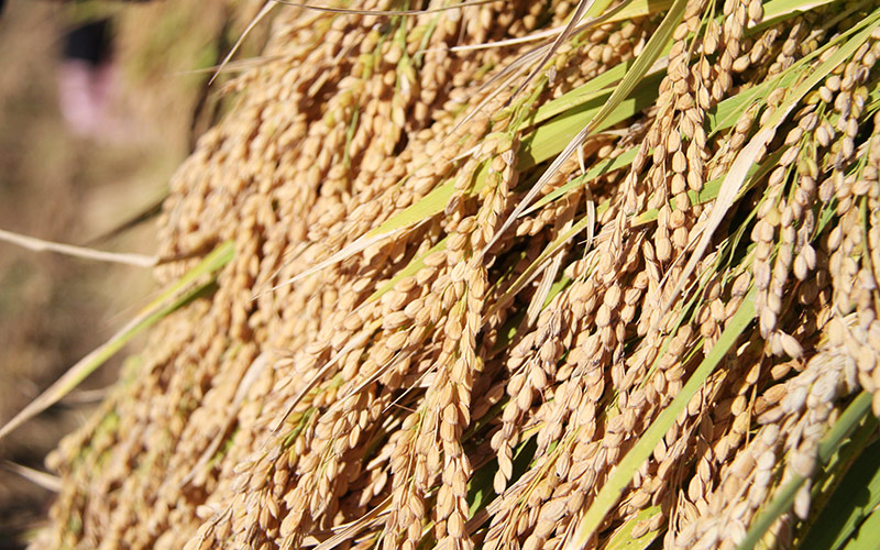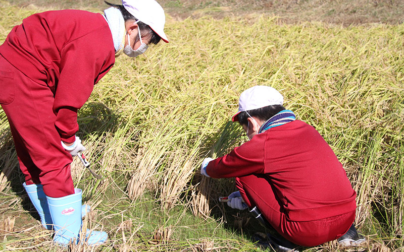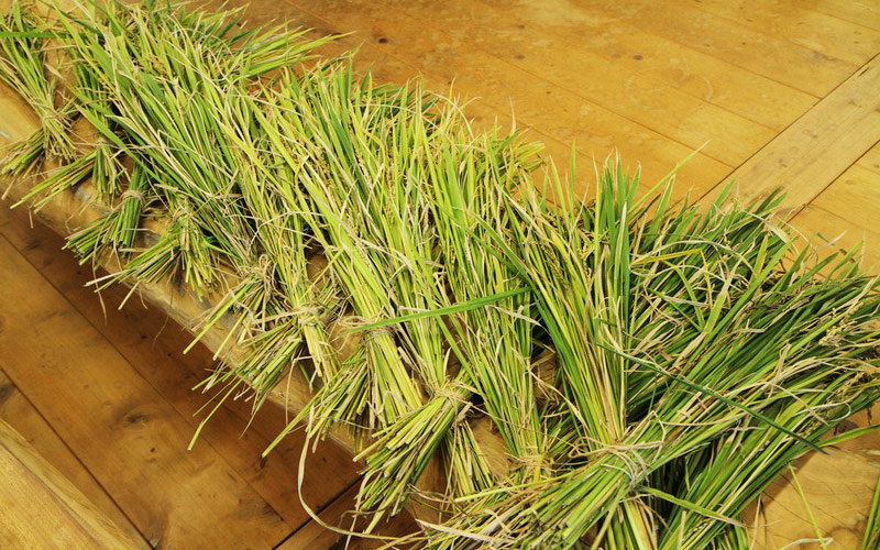 稲を「順手」で握り、根元をカマで刈り取ります。