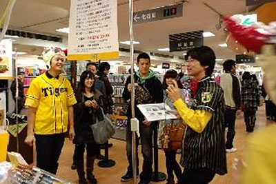 ▲東戸塚ロフトは大仏が司会。銘菓「戸塚とうふ」を早食いで競う