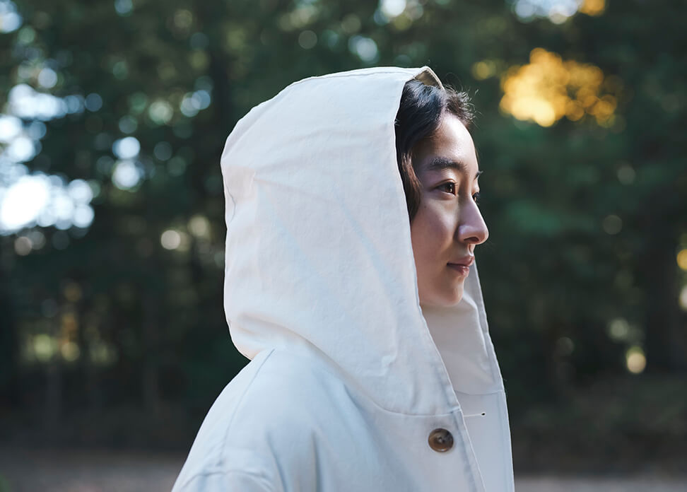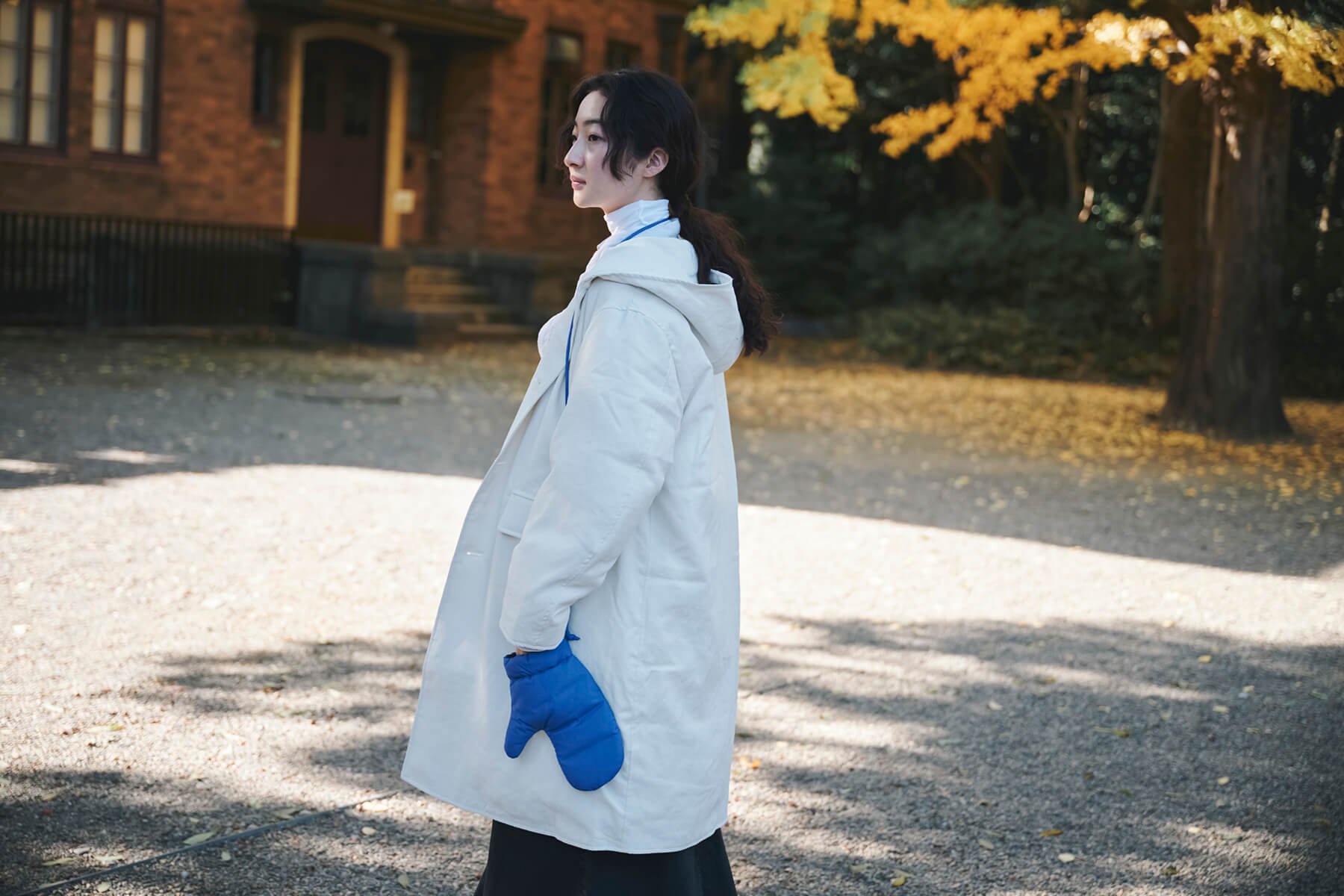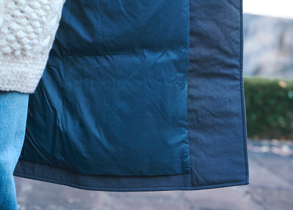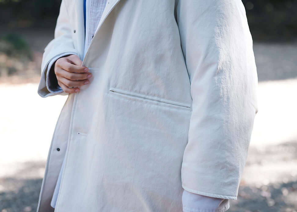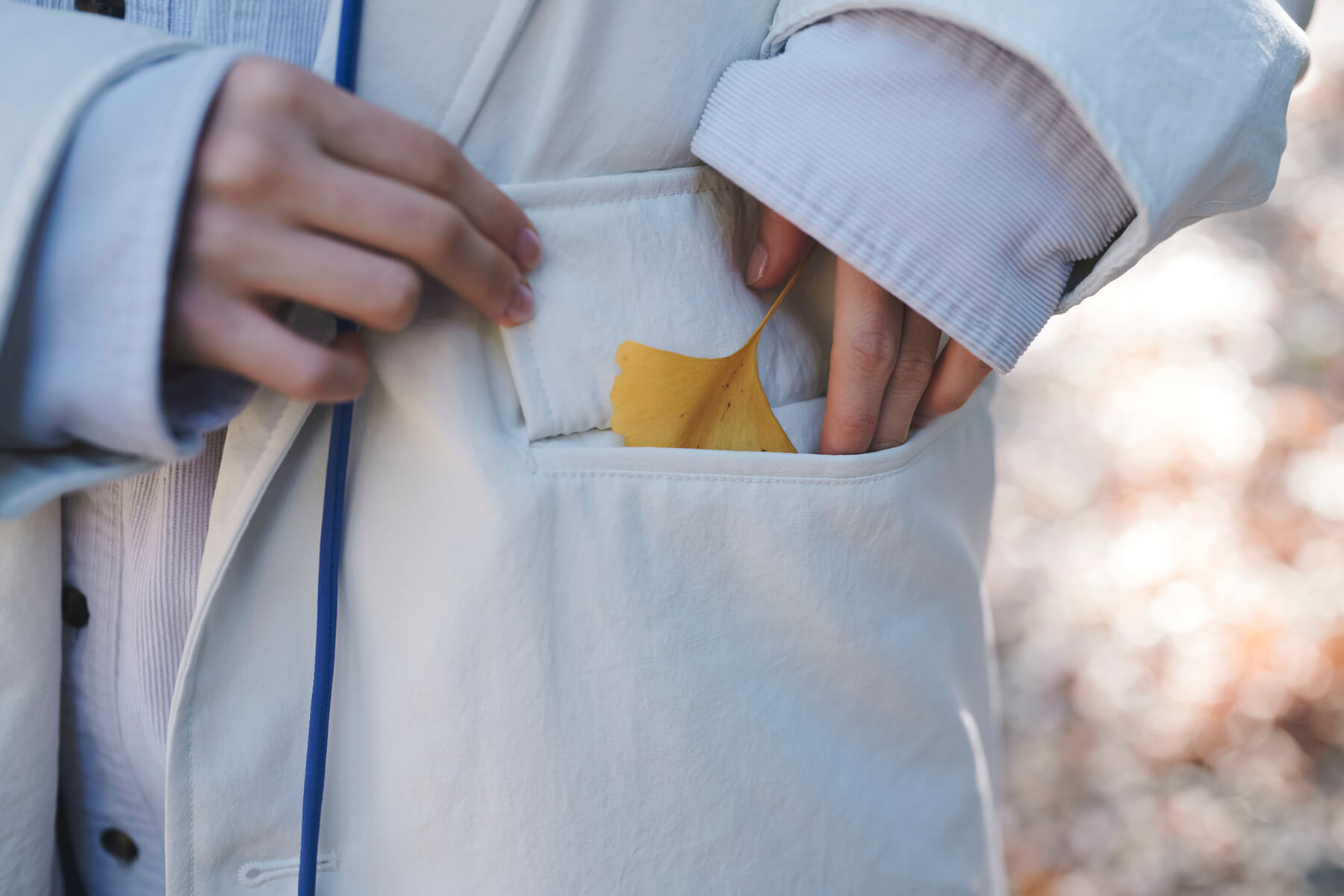 素材は、軽さとしなやかさ、高い撥水性を兼ね備えたポリエステル。表地の質感はカサっとした、天然繊維のような印象です。中空糸と呼ばれる筒状の糸を織り上げることで、空洞の中に空気を閉じ込め、ダウン本来の温かさを感じやすいのが特長。裏地にはマットな質感となめらかさを持つ、ナイロンタフタを使用しています。ポケット袋布はトリコットスエードを使用。どちらも接触冷感を抑えた柔らかな肌触りの素材です。