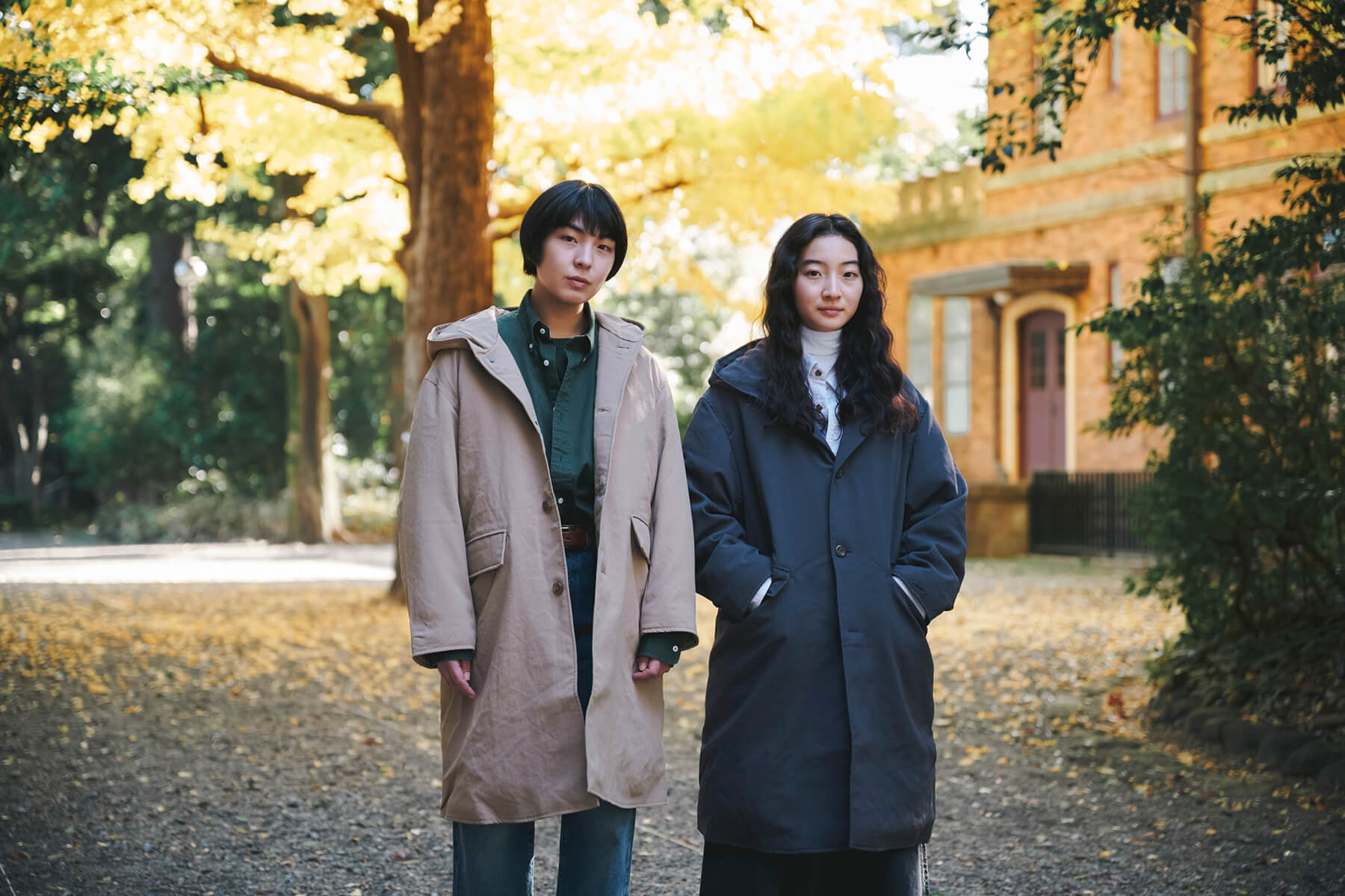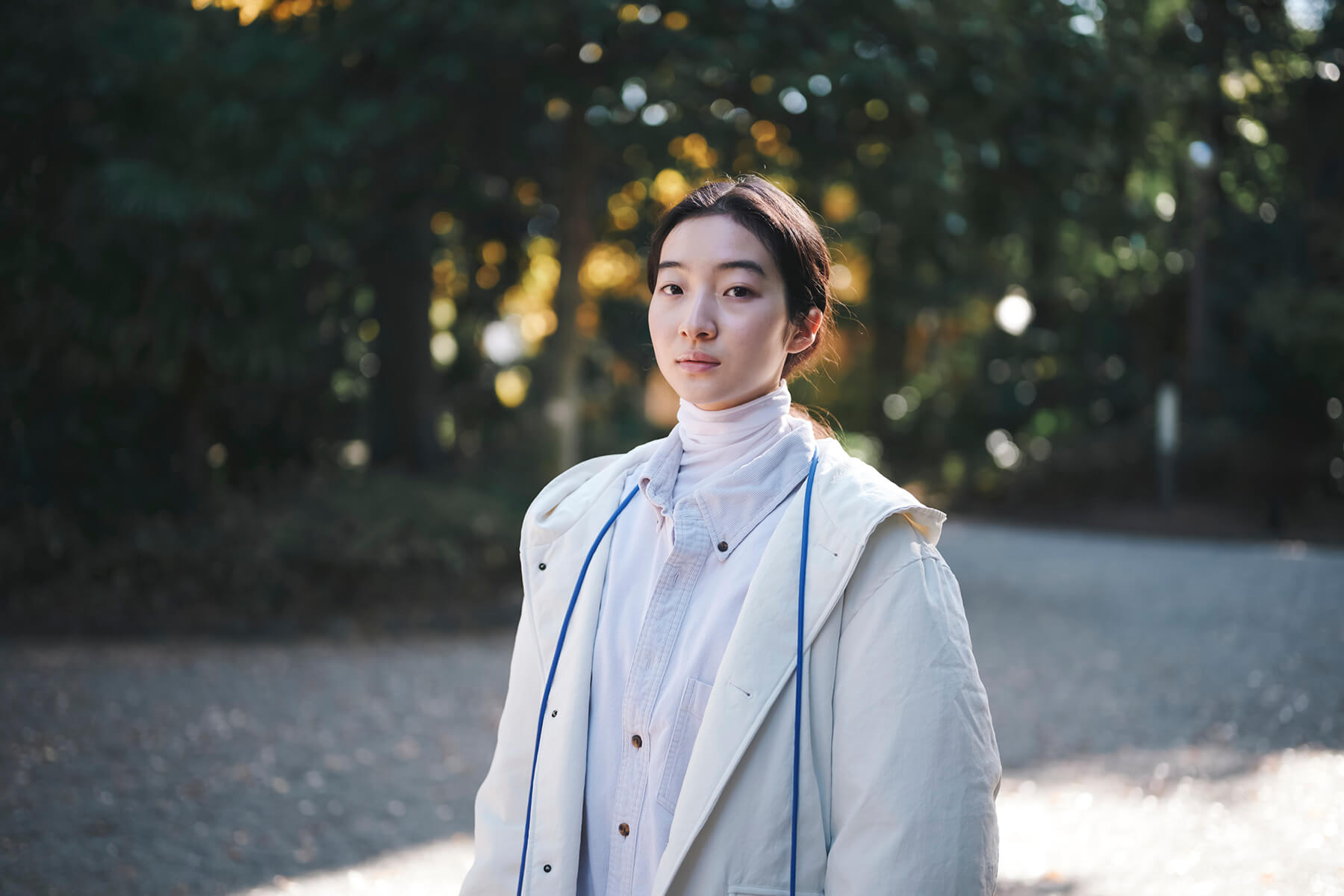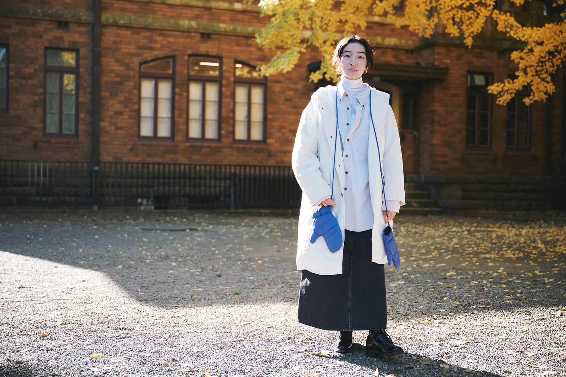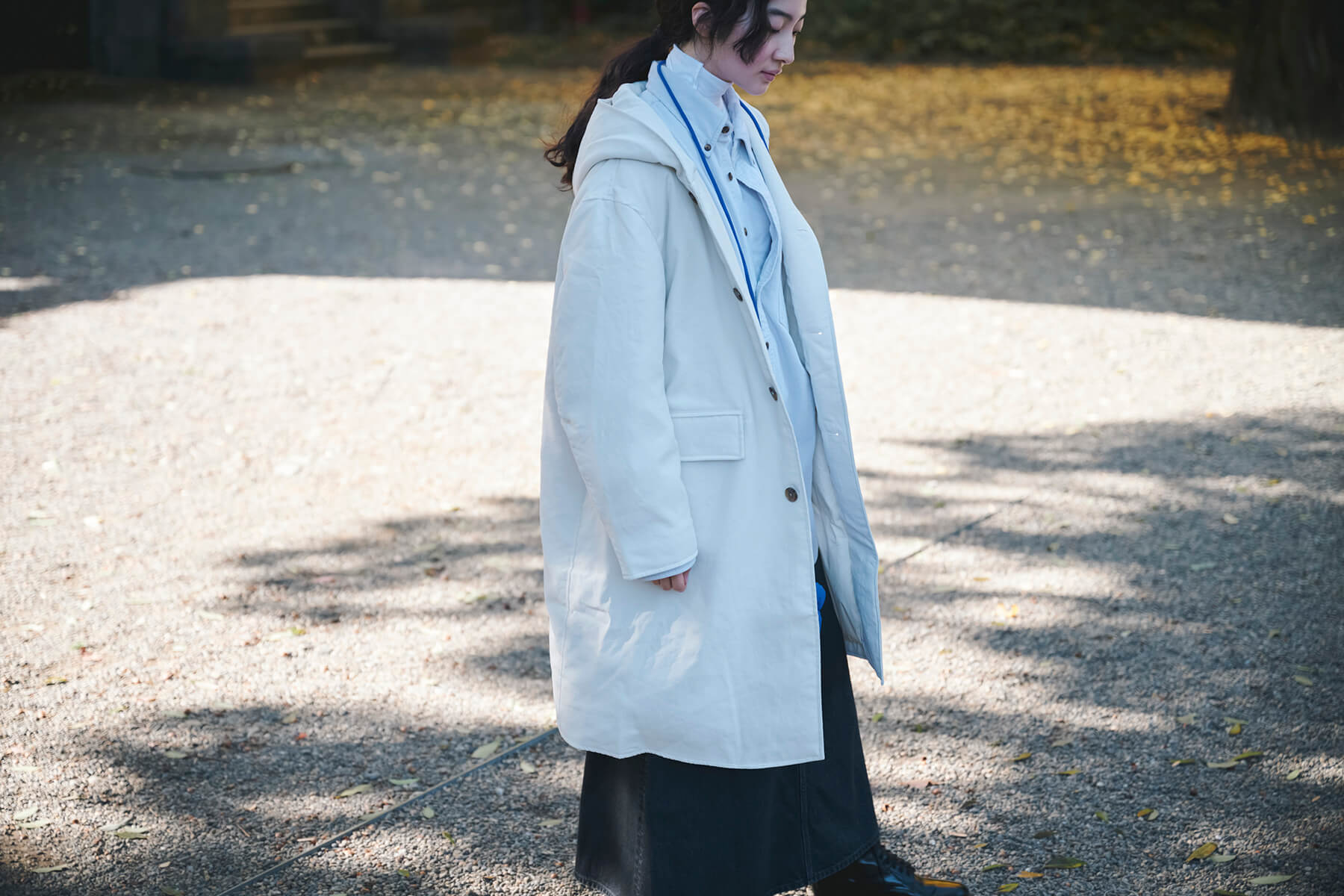 素材は、軽さとしなやかさ、高い撥水性を兼ね備えたポリエステル。表地の質感はカサっとした、天然繊維のような印象です。中空糸と呼ばれる筒状の糸を織り上げることで、空洞の中に空気を閉じ込め、ダウン本来の温かさを感じやすいのが特長。裏地にはマットな質感となめらかさを持つ、ナイロンタフタを使用しています。ポケット袋布はトリコットスエードを使用。どちらも接触冷感を抑えた柔らかな肌触りの素材です。