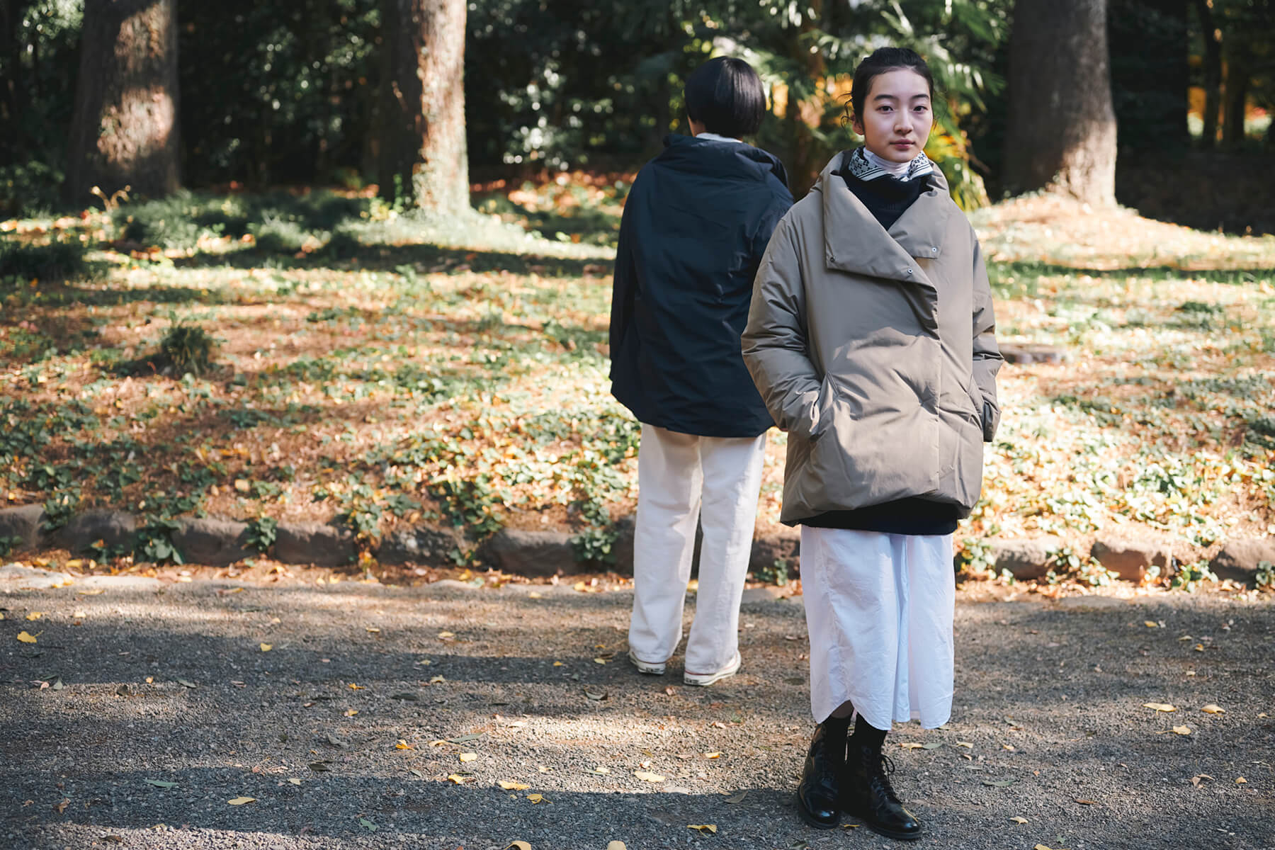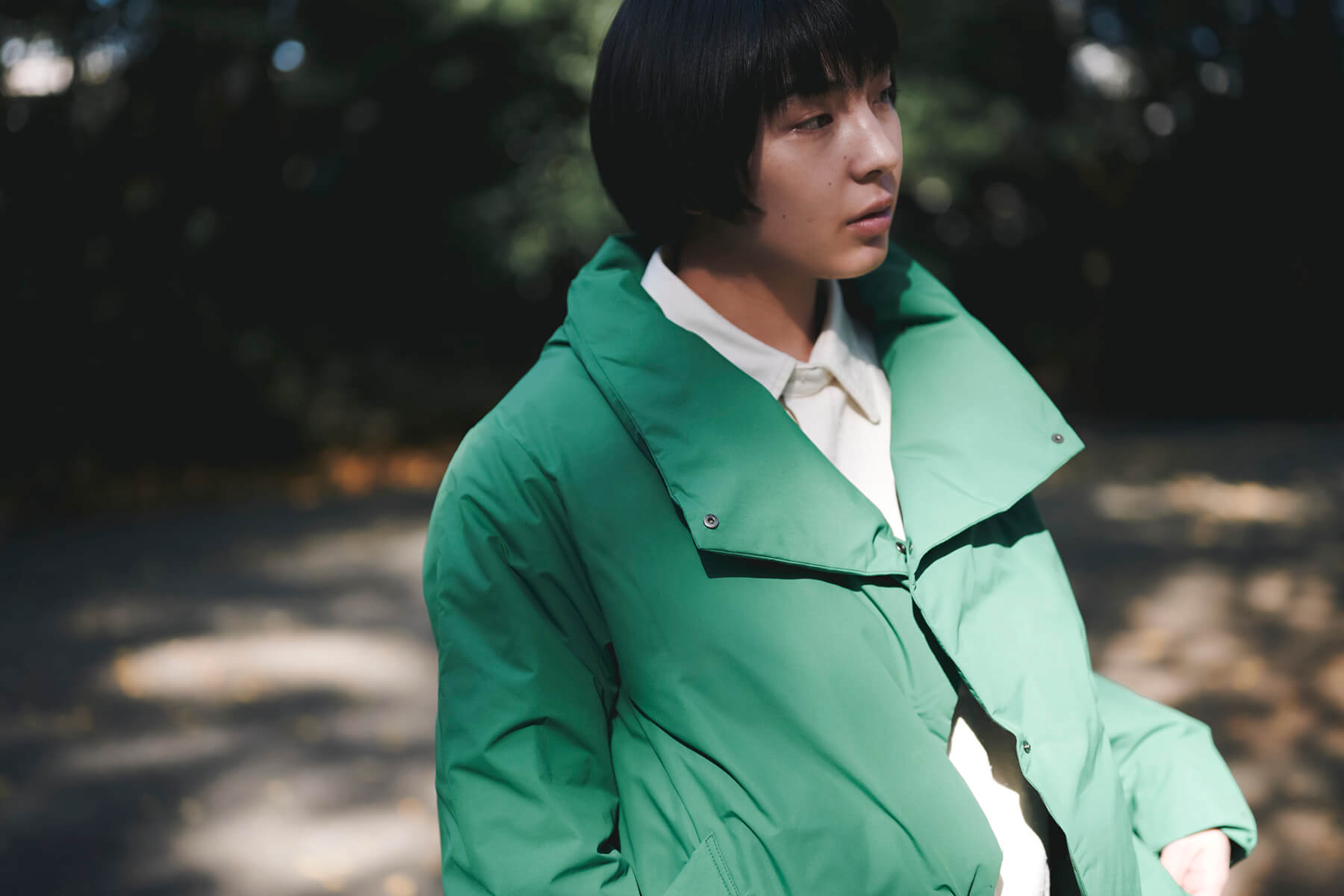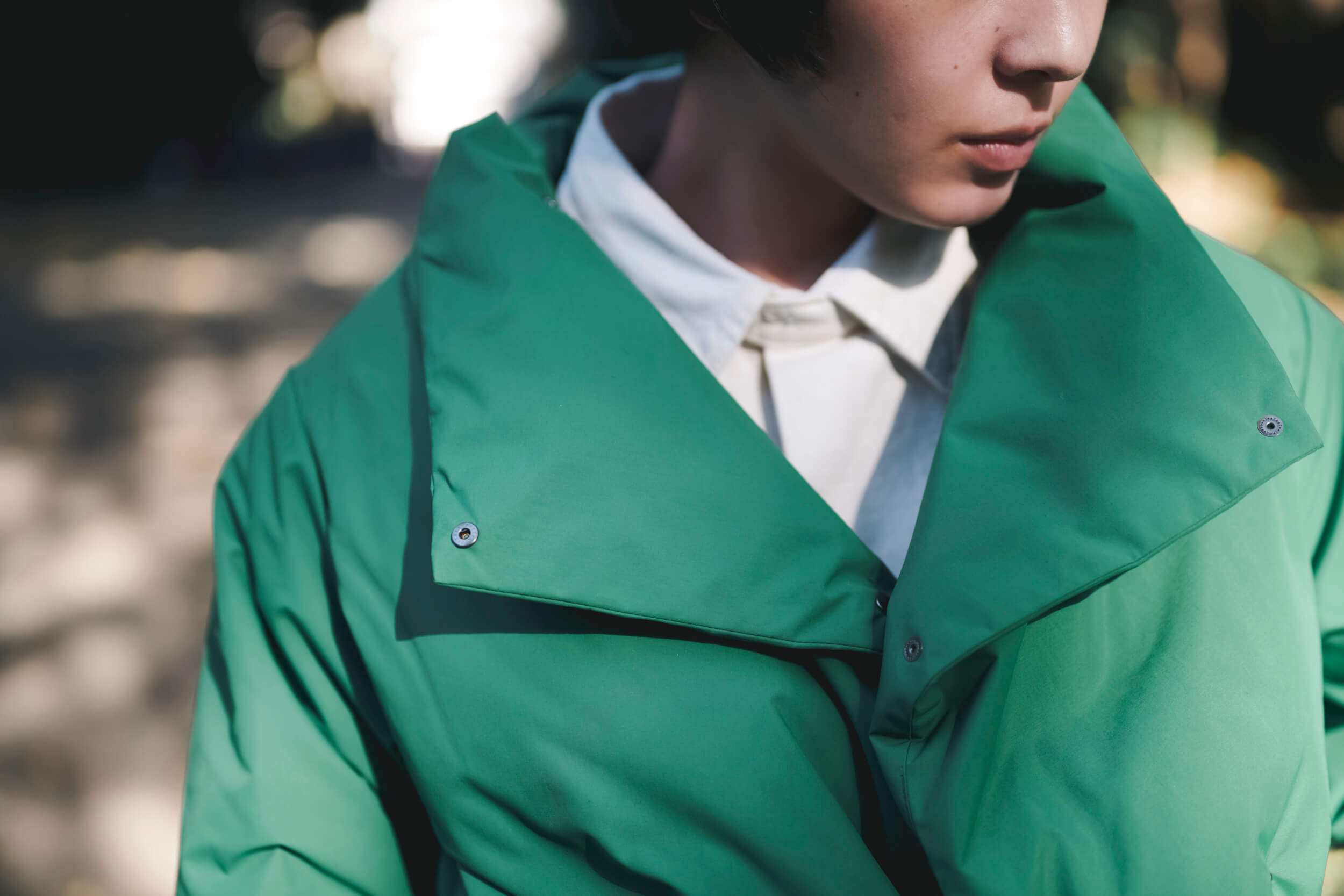 隠しドットボタンをトップまで閉めると、温かそうなスタンドカラーコートに。ボタンを外せば、大きなラペル襟のようになり、抜け感のあるアレンジが可能です。