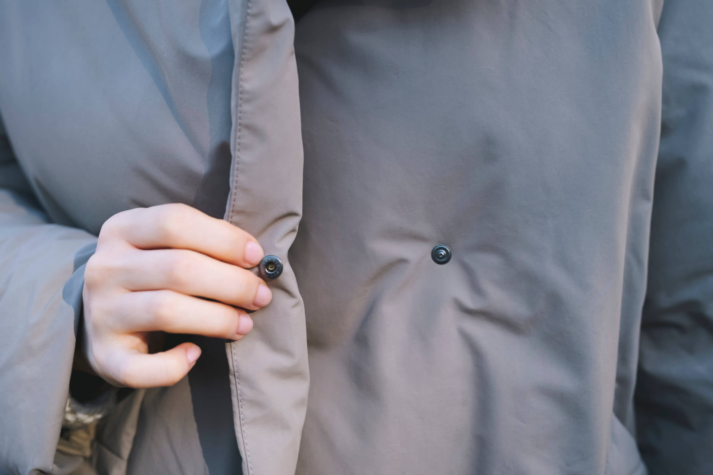 襟元から下まで、小さなドットボタンが2列配置されており、シンプルなデザインを邪魔しません。